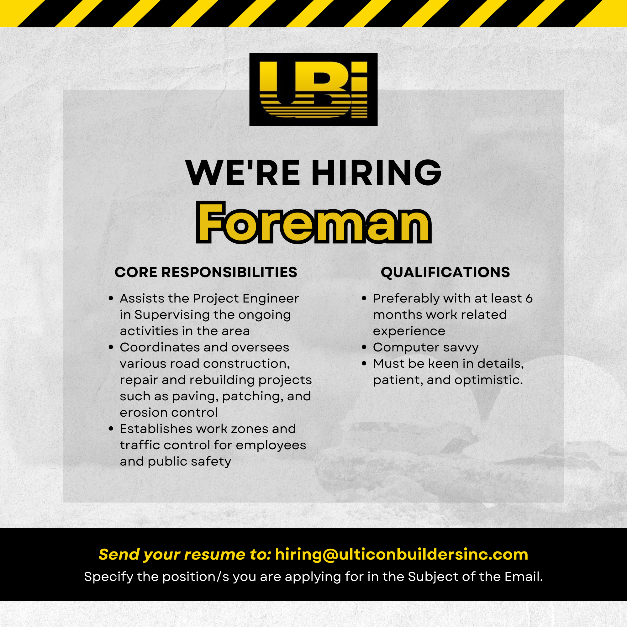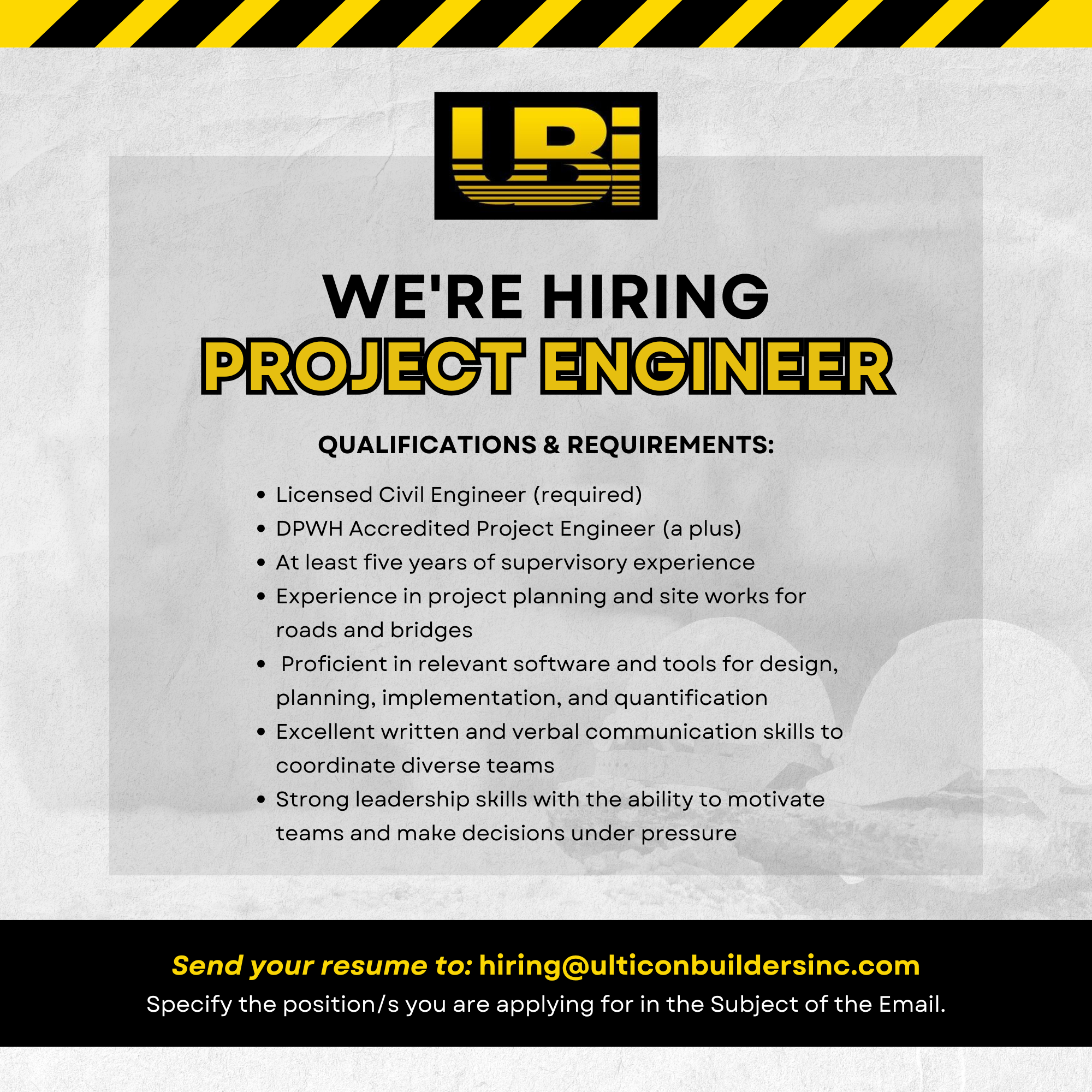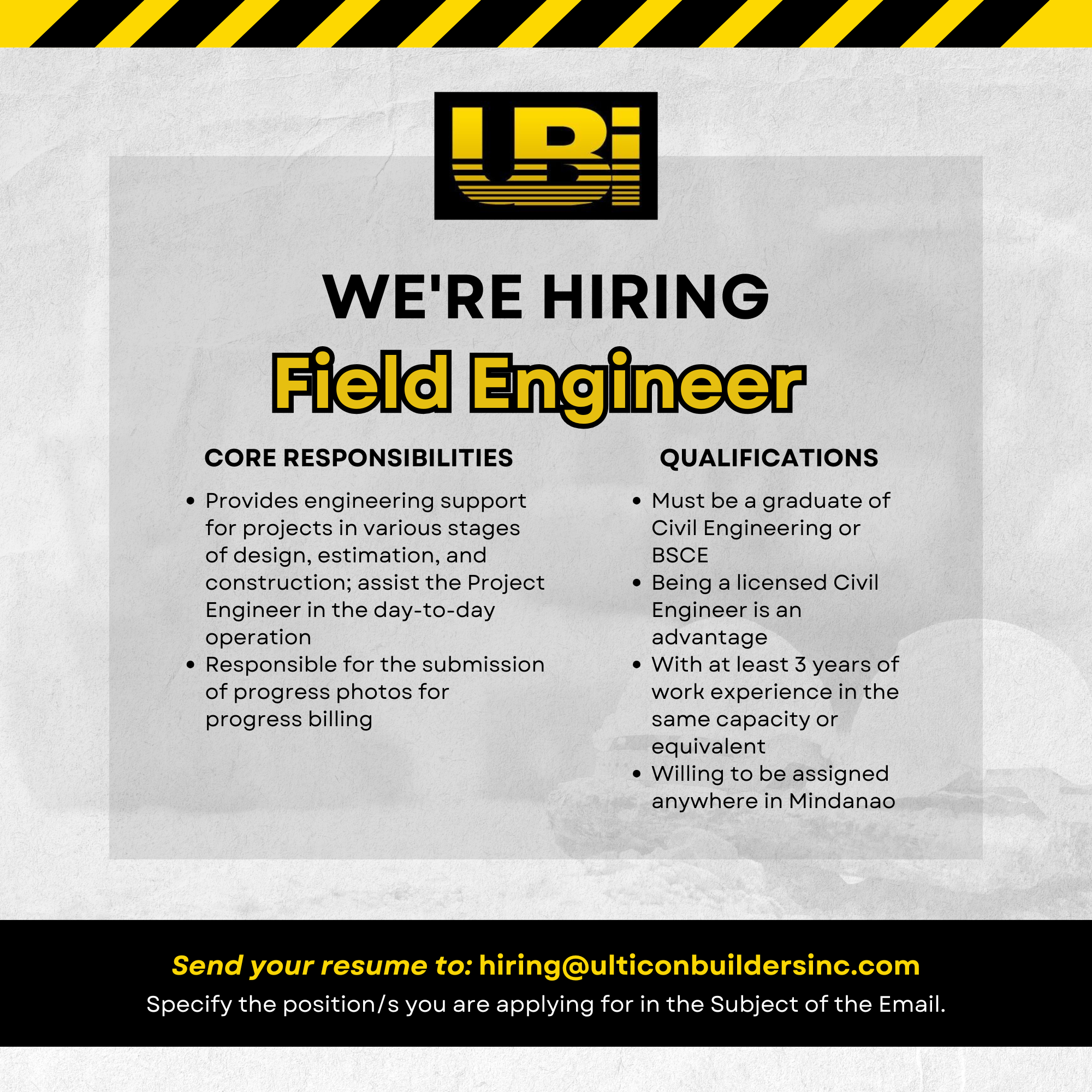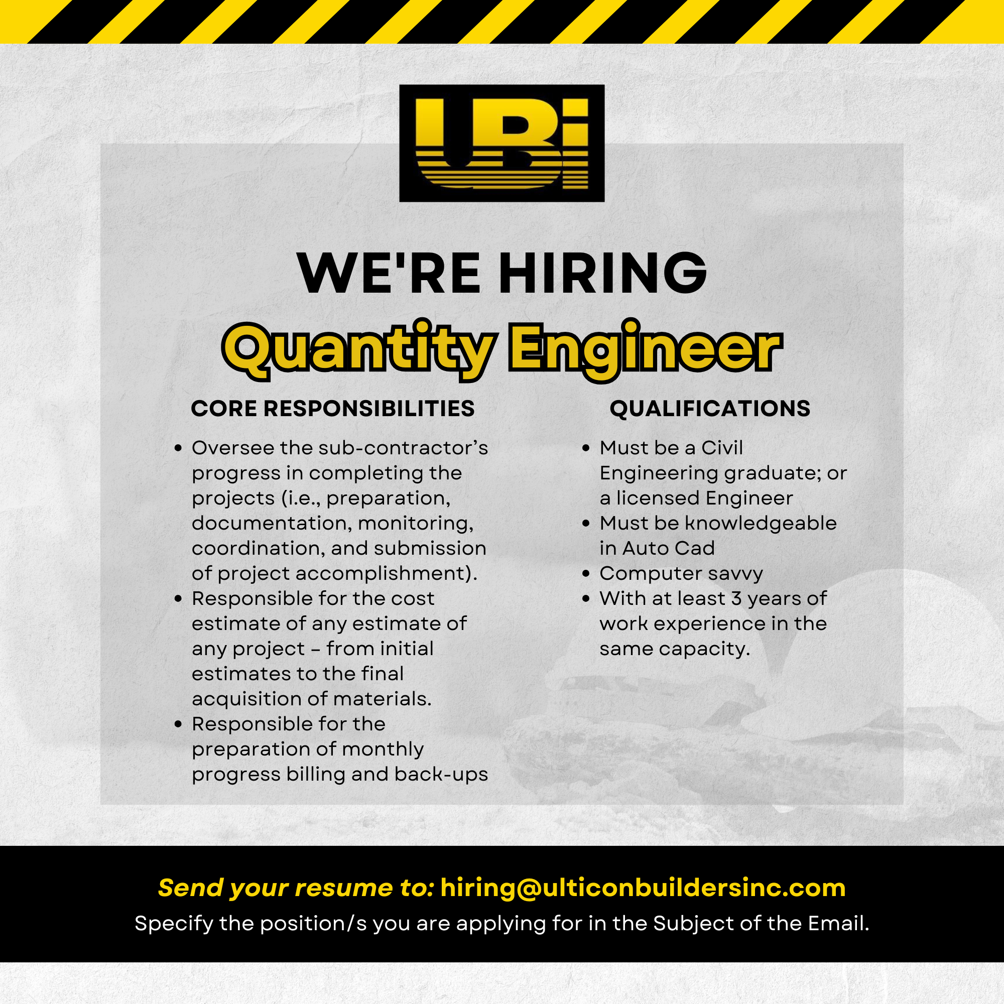 Send your resumé to hiring@ulticonbuildersinc.com. Specify the position/s you are applying for.