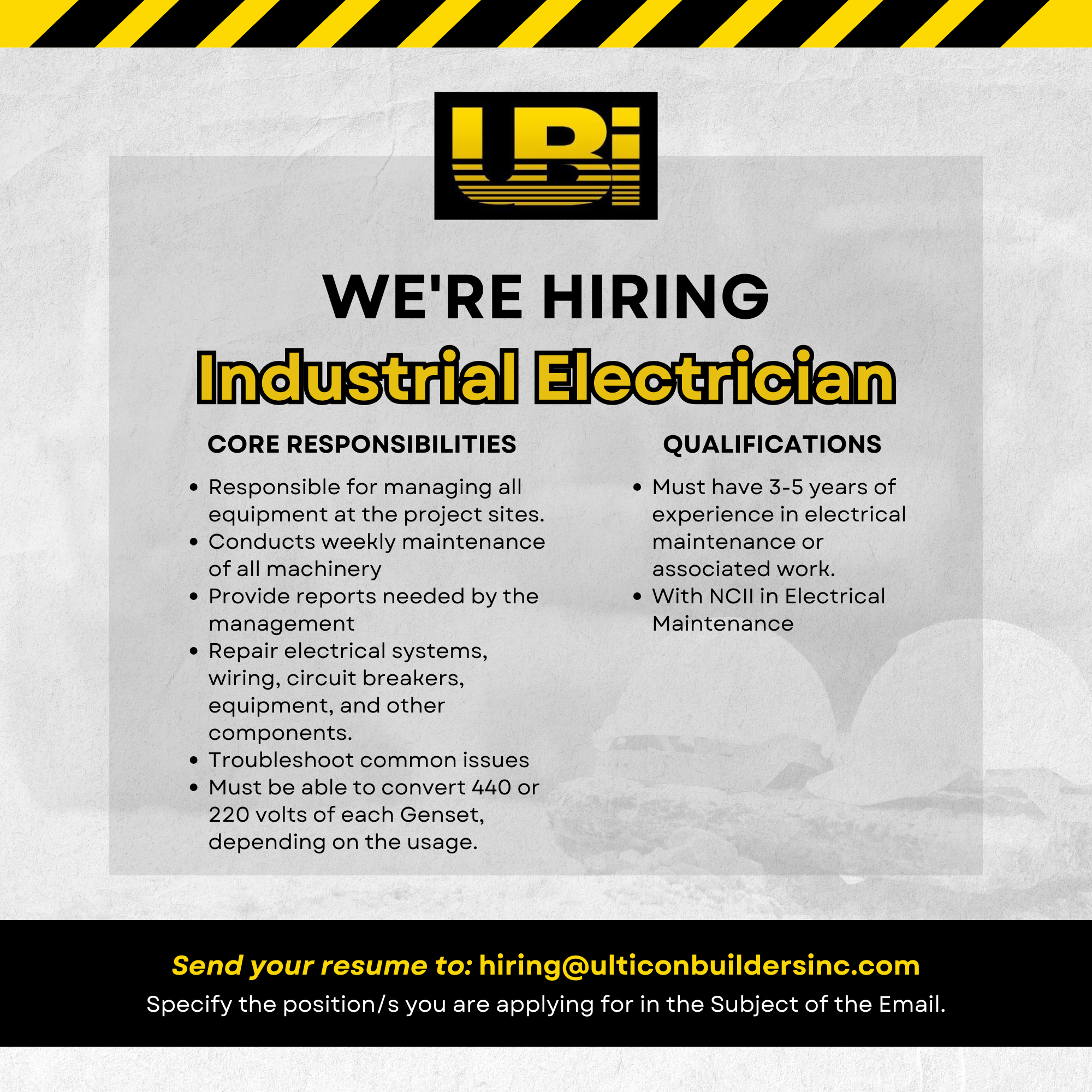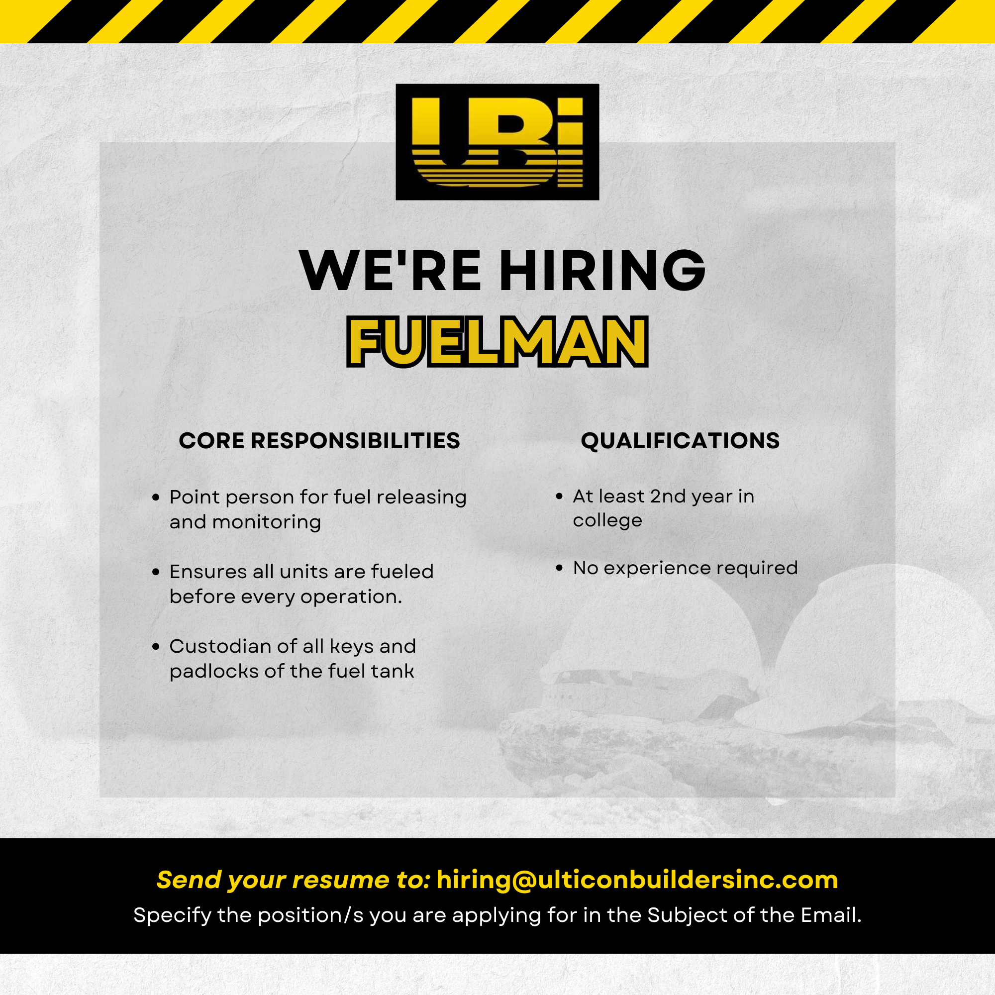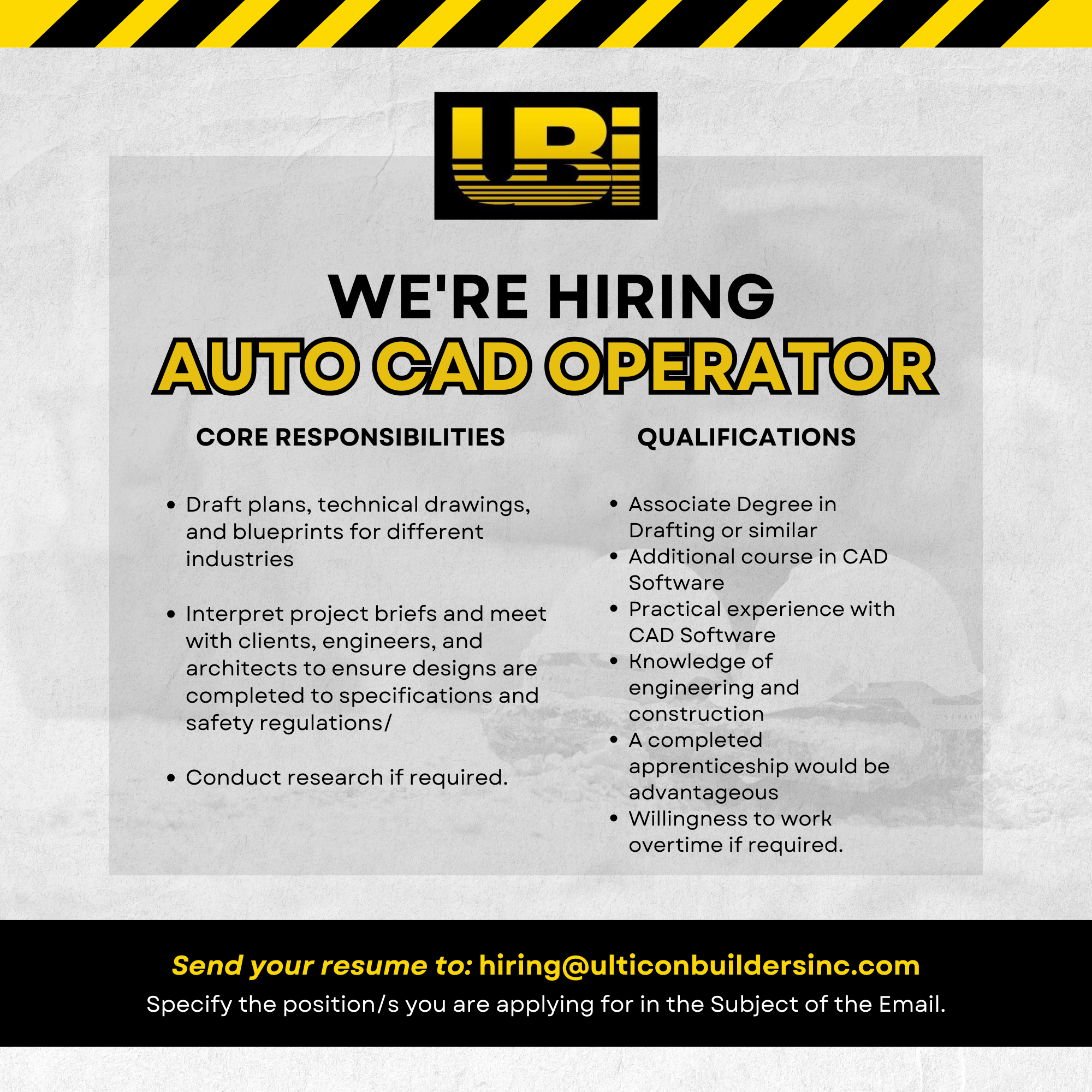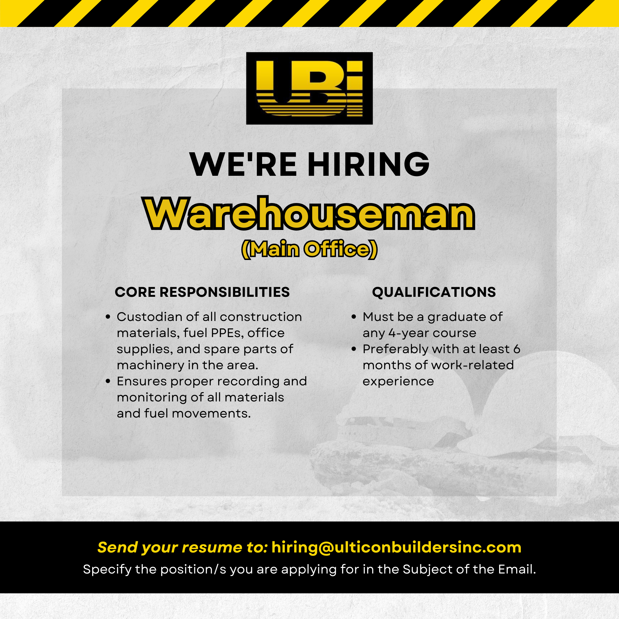 Send your resumé to hiring@ulticonbuildersinc.com. Specify the position/s you are applying for.