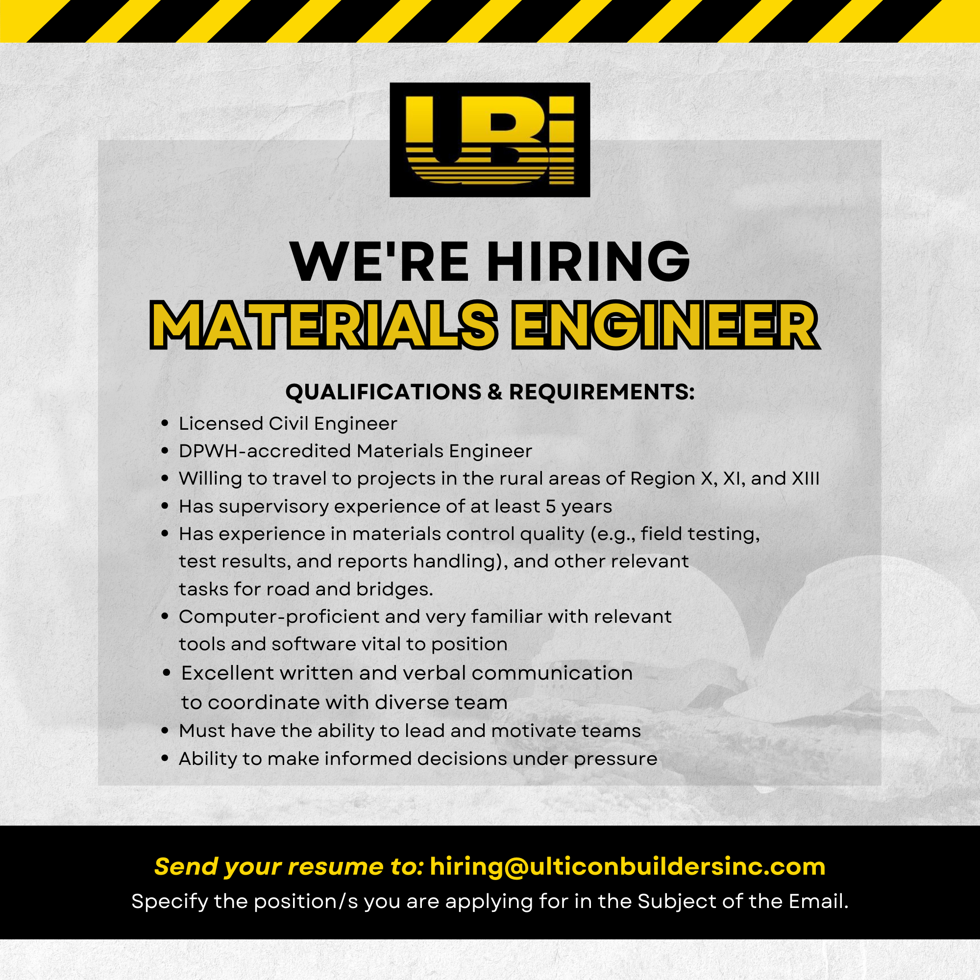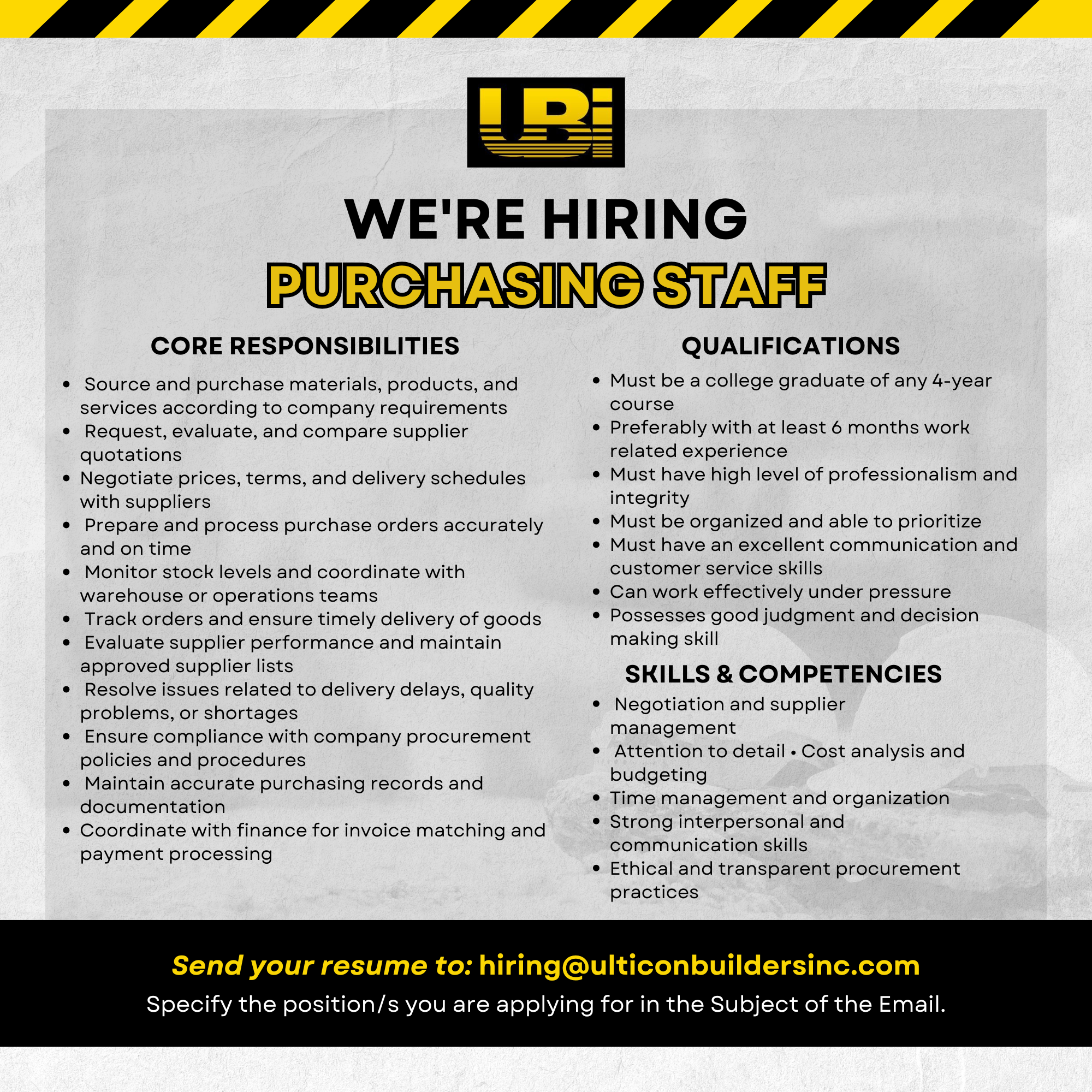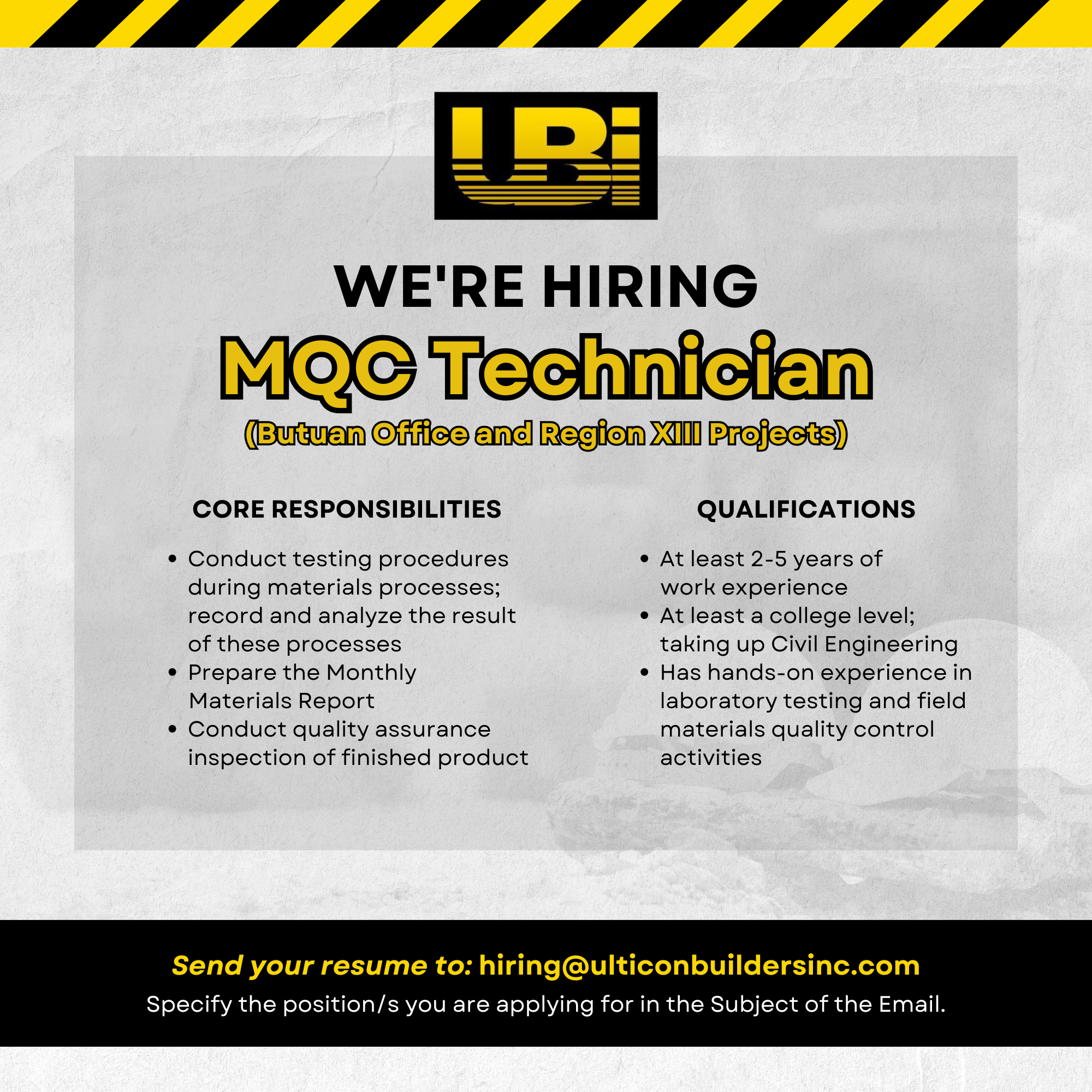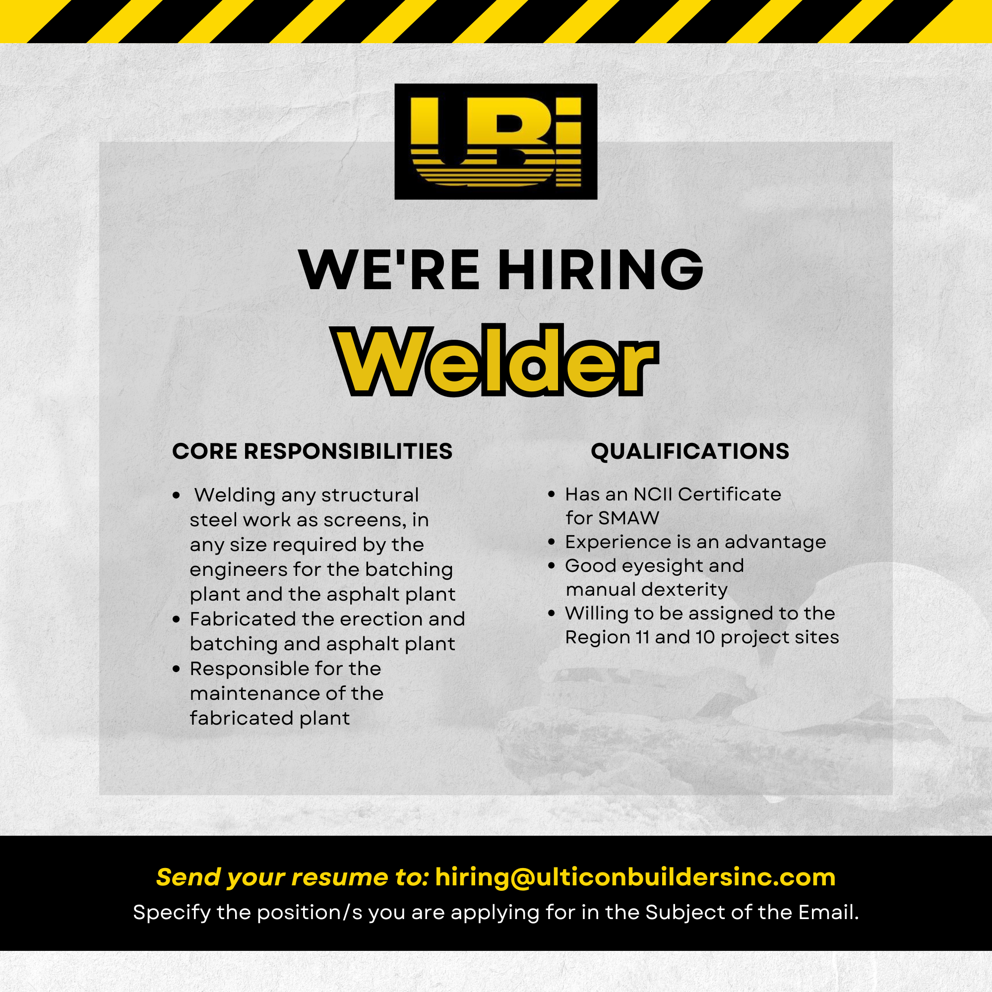 Send your resumé to hiring@ulticonbuildersinc.com. Specify the position/s you are applying for.