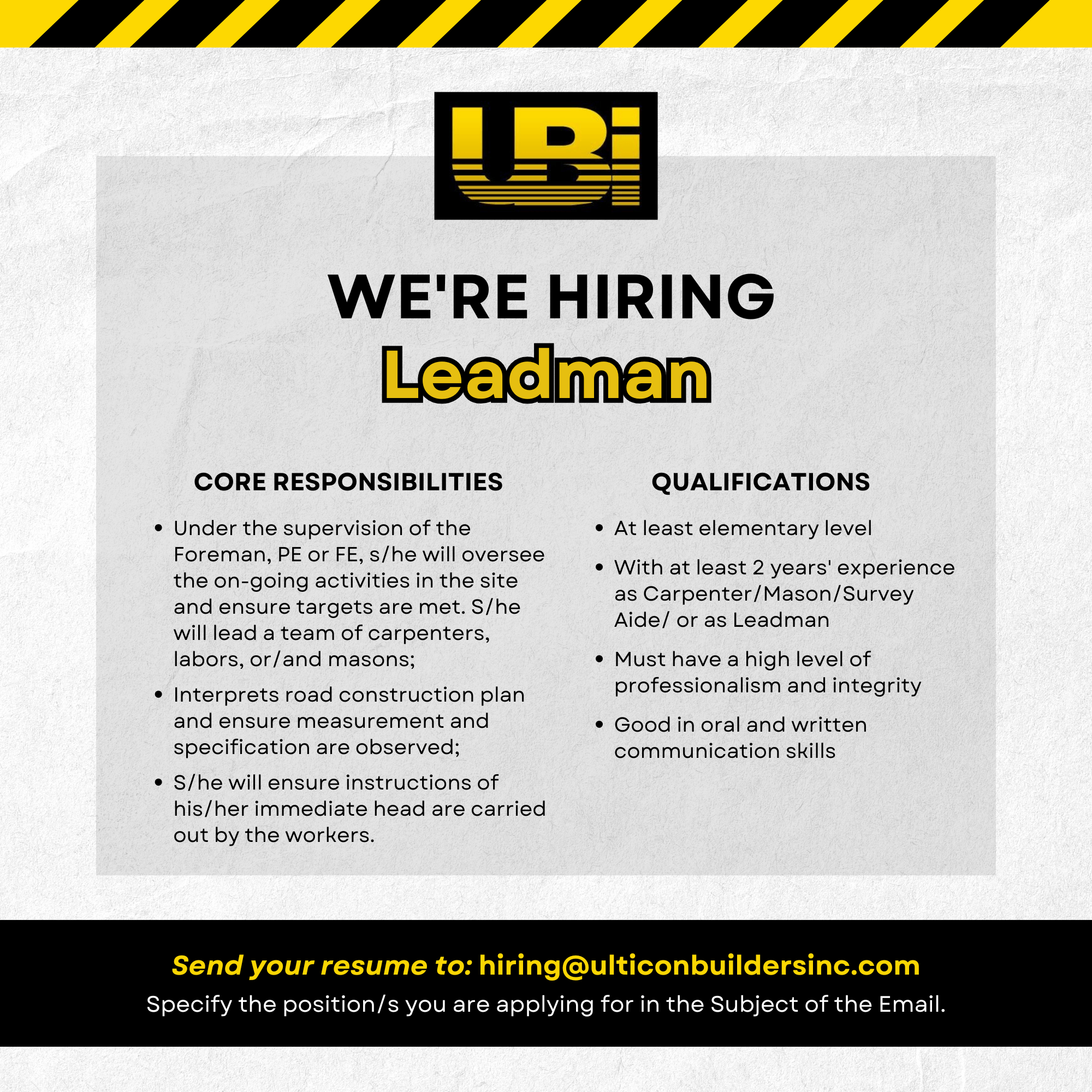 HIRING 📣 Send your resumé to hiring@ulticonbuildersinc.com. Specify the position/s you are applying for.